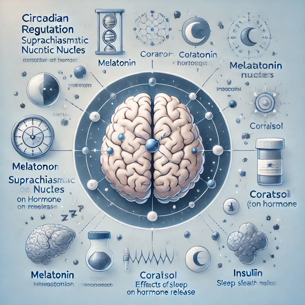 Alt text: "Brain diagram showing circadian regulation centers such as the suprachiasmatic nucleus (SCN), highlighting the impact of irregular sleep schedules on melatonin, cortisol, and insulin release. Designed to explain how social jet lag disrupts hormonal balance and sleep architecture."