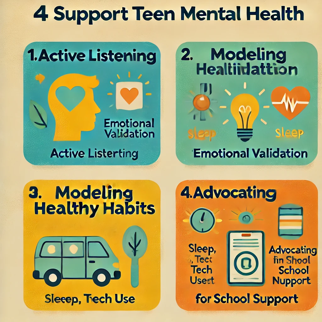 Alt text: Alt text: "Checklist illustration for parents and teachers featuring four key actions: active listening, emotional validation, modeling of healthy routines (like sleep, nutrition, and tech use), and school-based mental health advocacy. Designed in a friendly visual format to encourage proactive adult involvement."