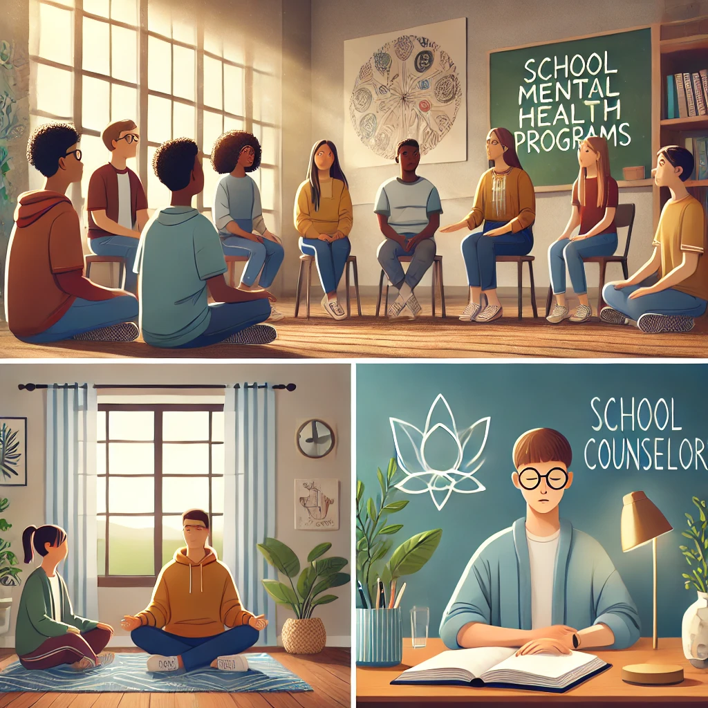 Alt text: “Photos of real school mental health programs: peer group, mindfulness class, and counselor office”