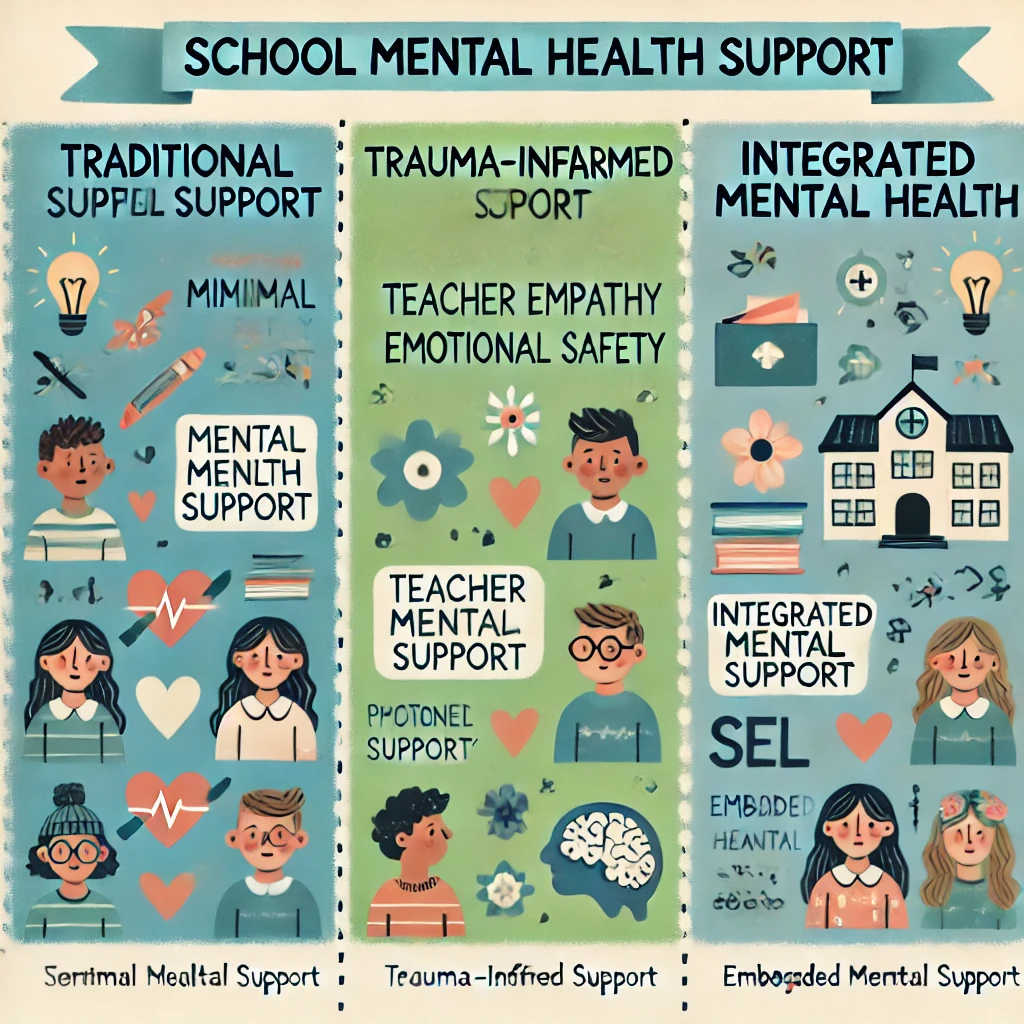 Alt text: "Infographic comparing three school mental health support models: Traditional (minimal mental health focus), Trauma-Informed (staff trained in emotional safety), and Integrated Mental Health (counselors, peer support, and SEL embedded). Designed to visually contrast school environments and outcomes."