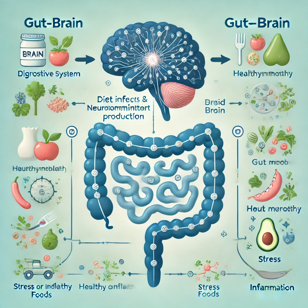 Alt text: “Diagram of gut-brain axis showing how diet influences mood and neurotransmitter production”