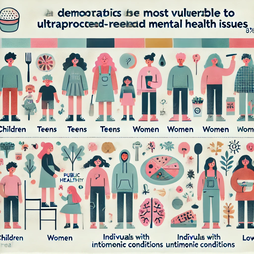 Alt text: "Infographic highlighting demographics most vulnerable to ultraprocessed food-related mental health issues, including children, teenagers, women, individuals with autoimmune conditions, and low-income communities. Designed to visually represent health disparities linked to dietary patterns."