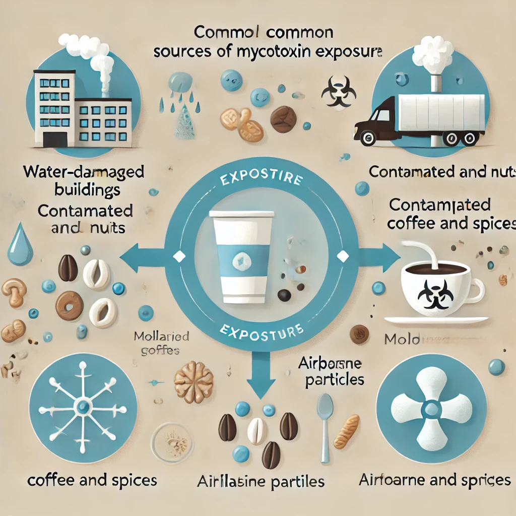 Alt text: "Educational diagram illustrating common sources of mycotoxin exposure including water-damaged buildings, contaminated grains and nuts, moldy coffee and spices, and airborne mycotoxin particles. Includes clear icons and arrows showing exposure pathways. Designed for public awareness and health education."