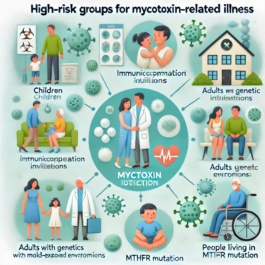Alt text: "Illustration highlighting high-risk groups: children, immune-compromised individuals, genetically predisposed adults, and those living in moldy environments."