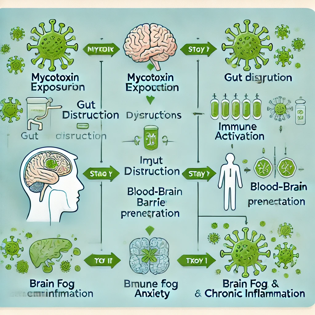 Alt text: "Flowchart-style infographic showing the progression from mycotoxin exposure to gut disruption, immune activation, blood-brain barrier penetration, and resulting symptoms like brain fog, anxiety, and chronic inflammation. Designed for educational health content."
