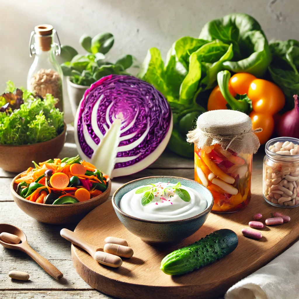 Alt text: A bowl of yogurt, kimchi, probiotic supplements, leafy greens, and colorful vegetables arranged neatly on a wooden table, symbolizing support for gut health