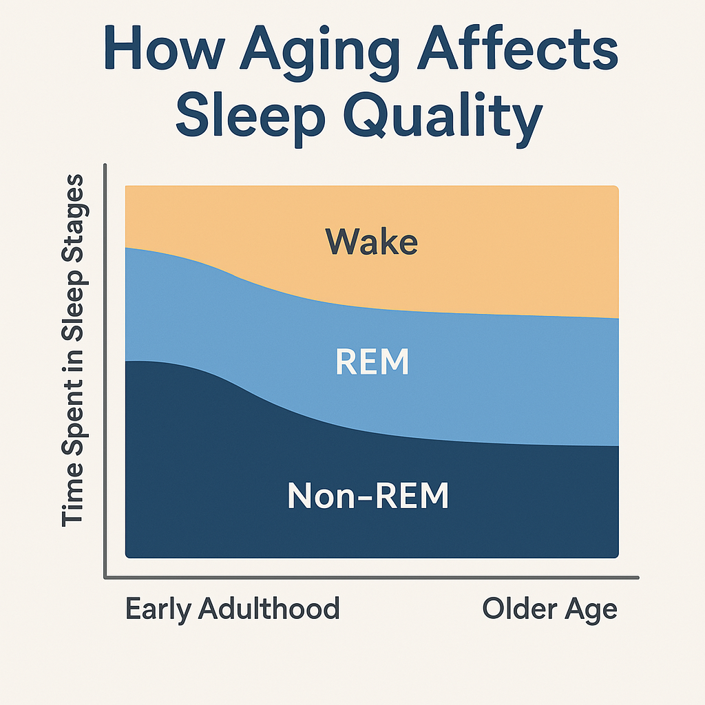 Increased Light Sleep (N1, N2): Deep sleep (N3) declines, while N1 becomes more dominant. This makes sleep more fragmented and less restorative.