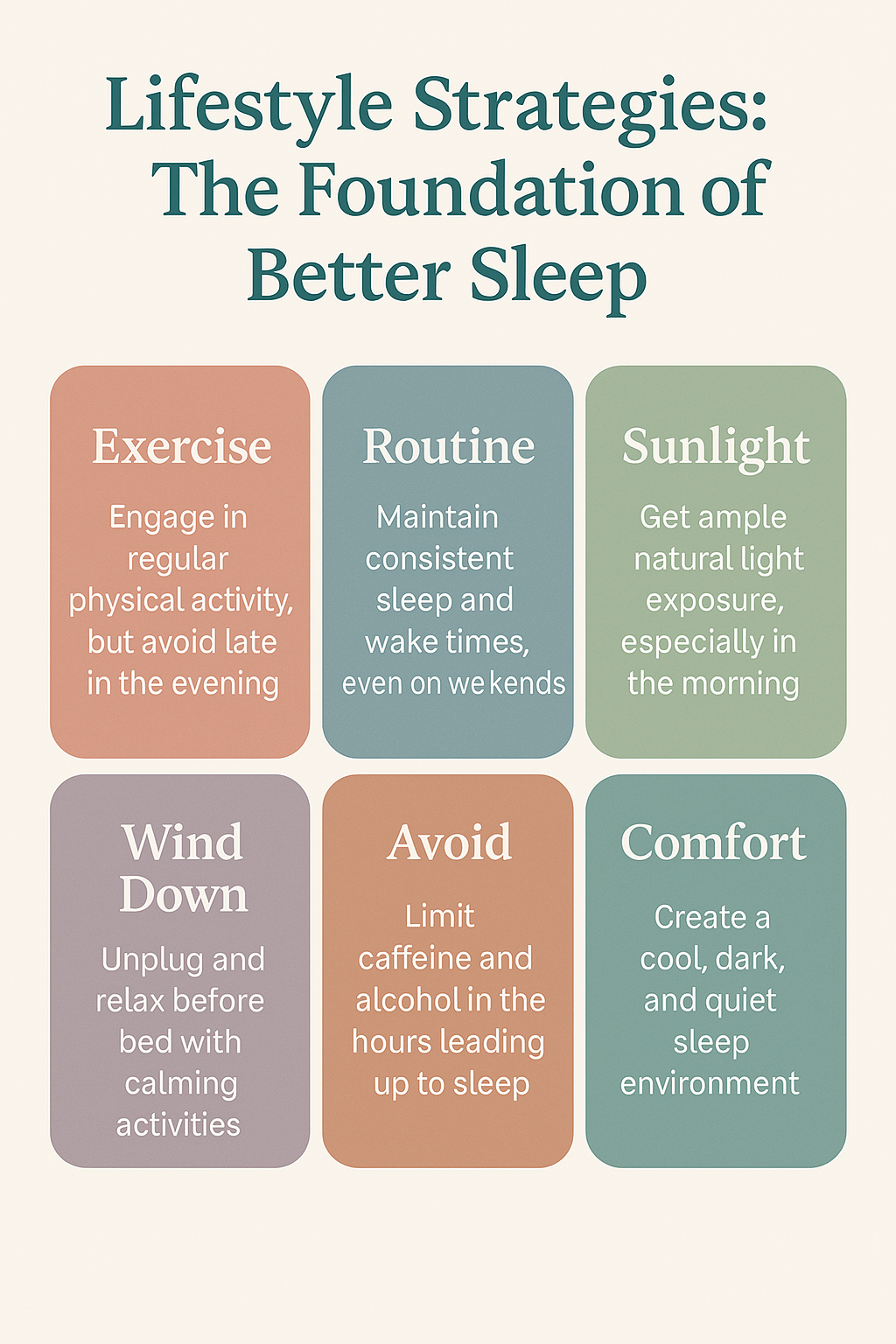 Limit Stimulants: No caffeine past 1–2 PM. Avoid alcohol 2–3 hours before bed.