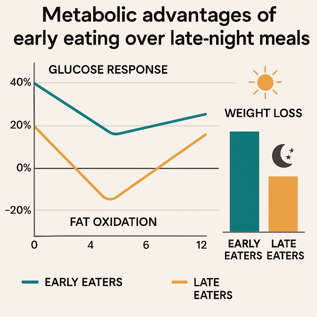 A 2020 randomized trial in Cell Metabolism found that even with identical calories, late eaters gained more fat and showed worsened glucose tolerance than early eaters.