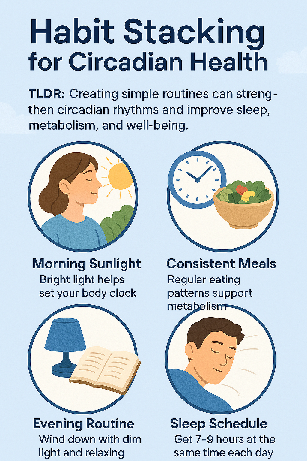 | Eat meals at the same time daily | Trains circadian hormone rhythm |