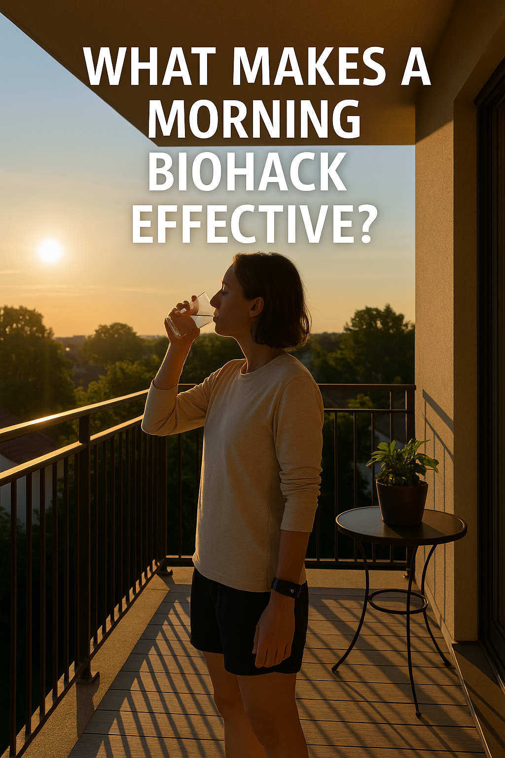 A peaceful early morning scene with a person standing on a balcony, bathed in sunlight, drinking water while wearing a sleep tracker. Overlay text: “What Makes a Morning Biohack Effective?”