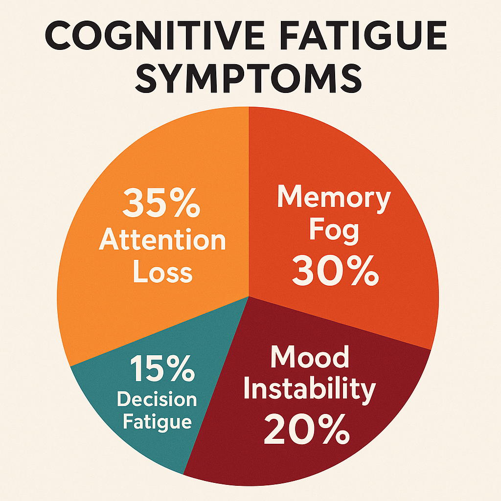 Image Prompt: "Pie chart infographic showing the distribution of cognitive fatigue symptoms: 35% attention loss, 30% memory fog, 20% mood instability, 15% decision fatigue."