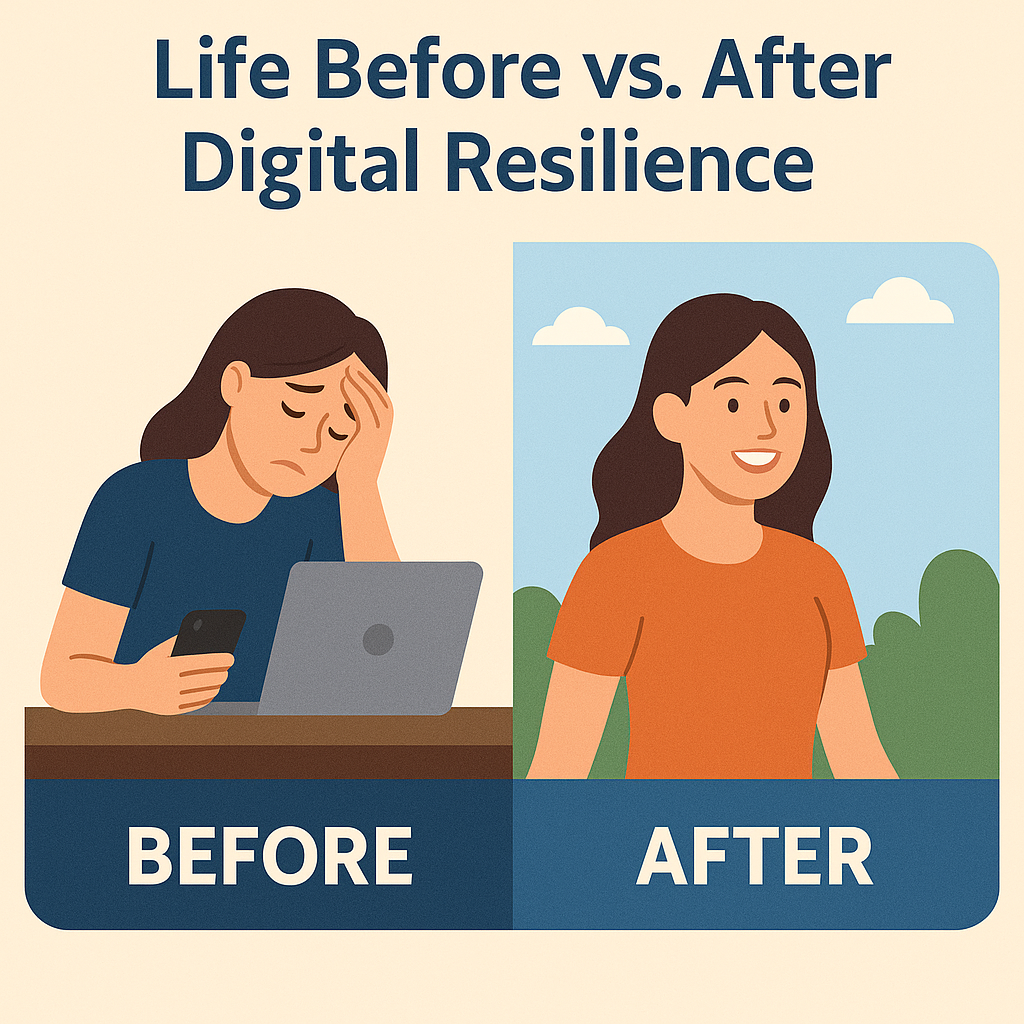 alt text: "Infographic showing a woman's transformation before and after building digital resilience. Left side: stressed woman using phone and laptop indoors. Right side: relaxed woman smiling outdoors after digital detox. Title: Life Before vs. After Digital Resilience."