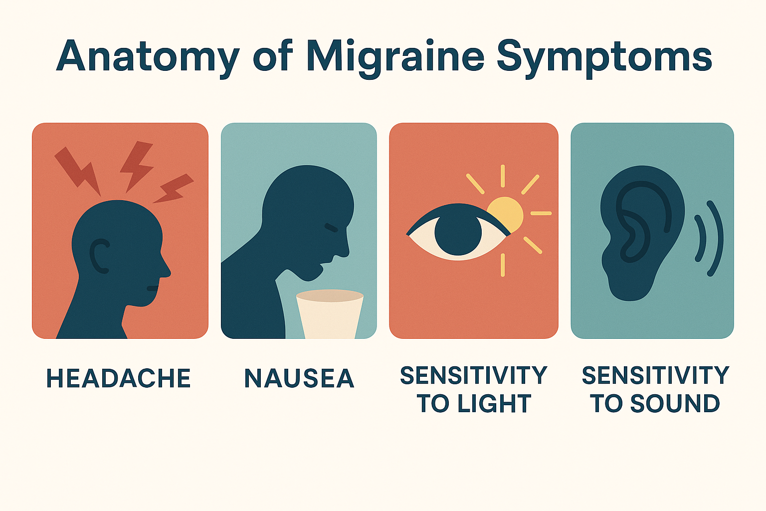 alt text: "Flat-style infographic showing four migraine symptoms: headache, nausea, light sensitivity, and sound sensitivity, each with visual icons."