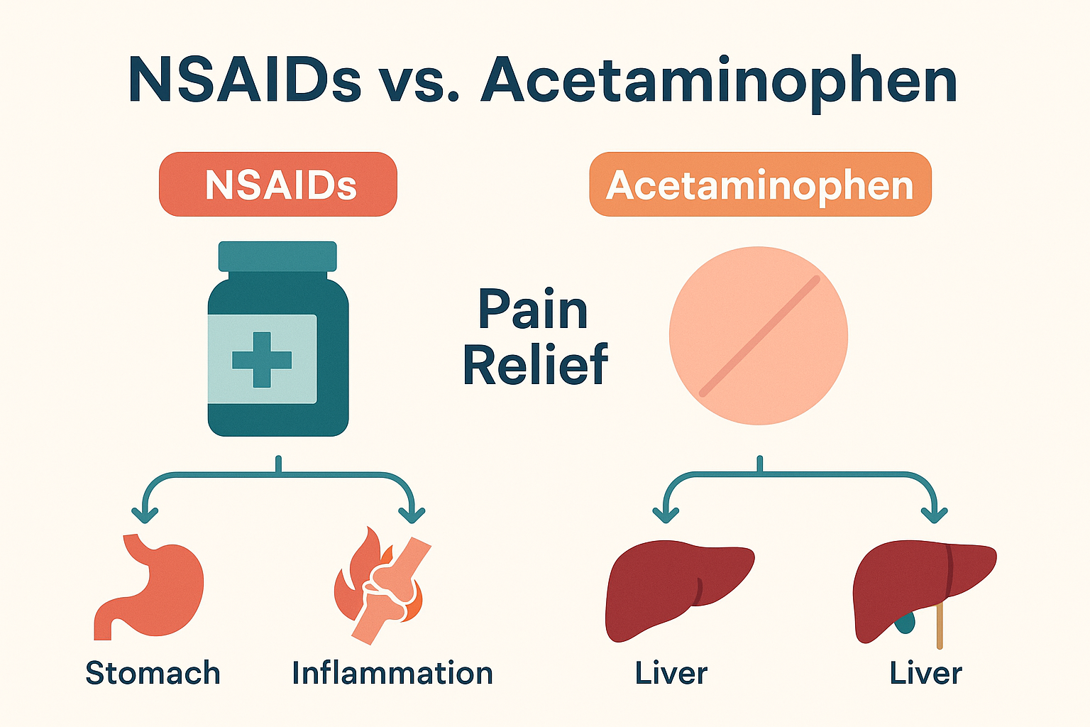 alt text: "Infographic comparing NSAIDs and Acetaminophen, highlighting stomach and inflammation risks for NSAIDs and liver toxicity risks for Acetaminophen."