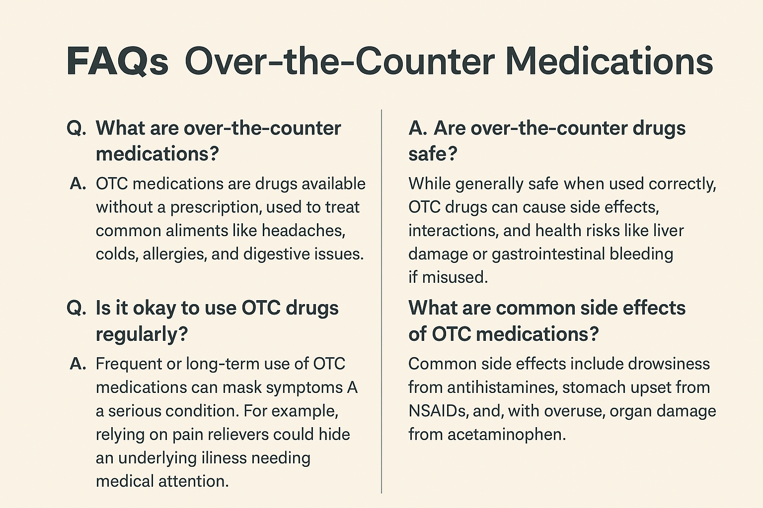 Alt text: Infographic showing four FAQ answers about OTC drugs, including their definition, safety, risks of regular use, and side effects.