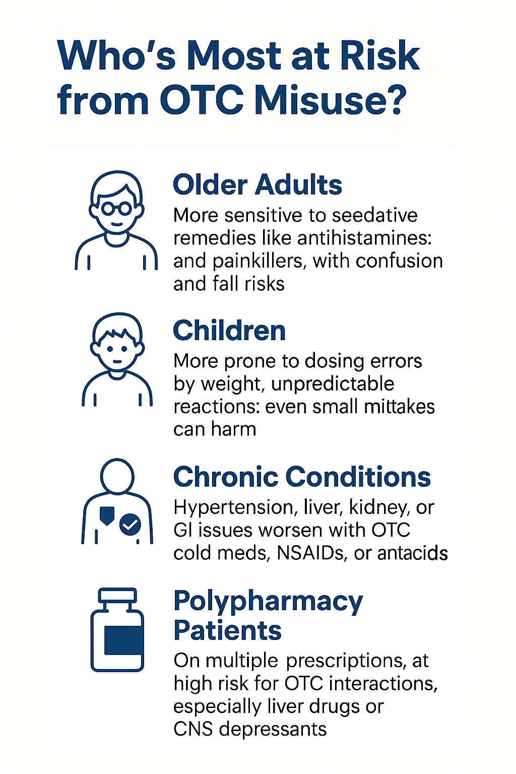 Alt text: "Who's Most at Risk from OTC Misuse?" displaying four high-risk groups—Older Adults, Children, Chronic Conditions, and Polypharmacy Patients—with simple icons and brief safety warnings for each.