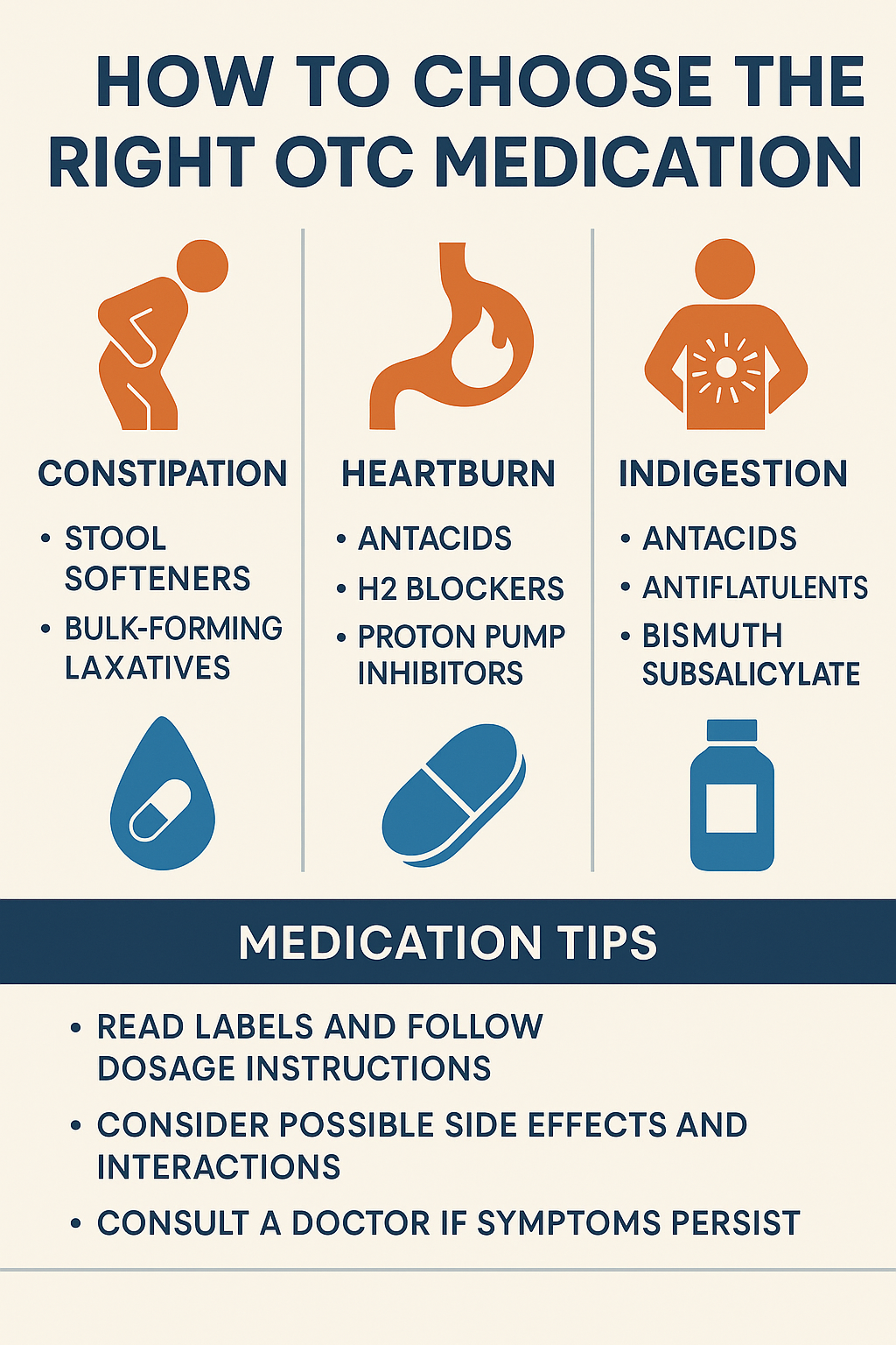 Alt Text: A clean and informative infographic visually explaining how to choose the right over-the-counter (OTC) medication based on common digestive symptoms such as constipation, heartburn, and indigestion, with icons and medication tips categorized by symptom.