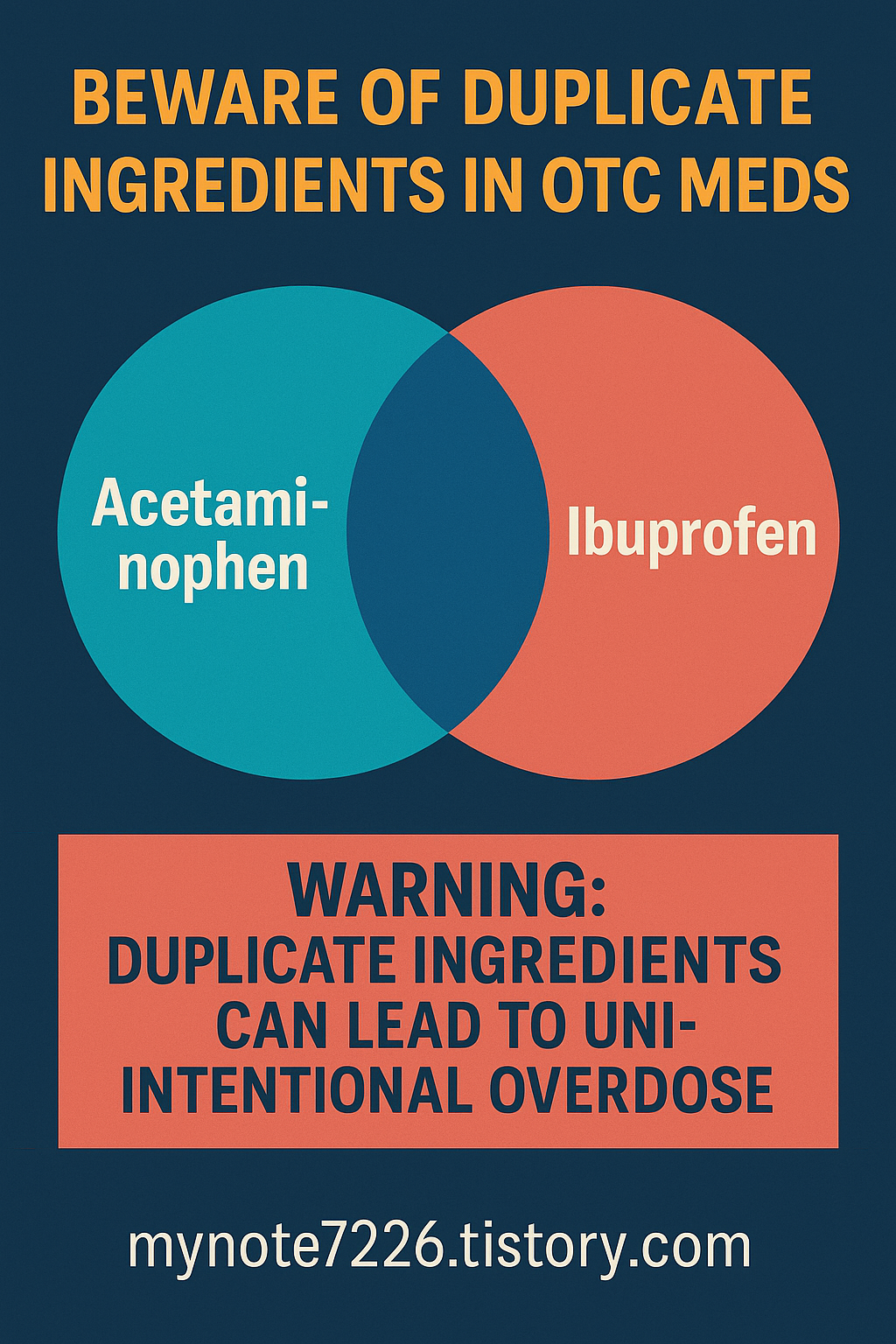 Alt Text: "Digital graphic comparing common overlapping ingredients in OTC medications like acetaminophen and ibuprofen, highlighting risks of unintentional overdose."