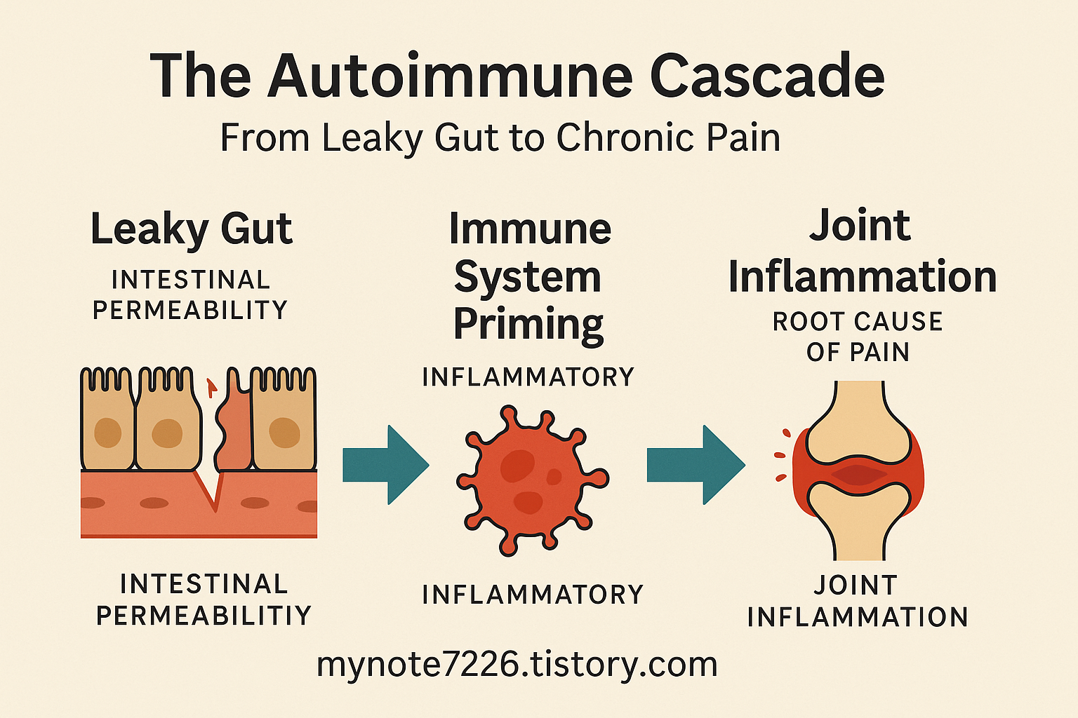 Alt Text: "Infographic showing the autoimmune cascade from leaky gut to immune system priming and joint inflammation, highlighting root causes of chronic pain."