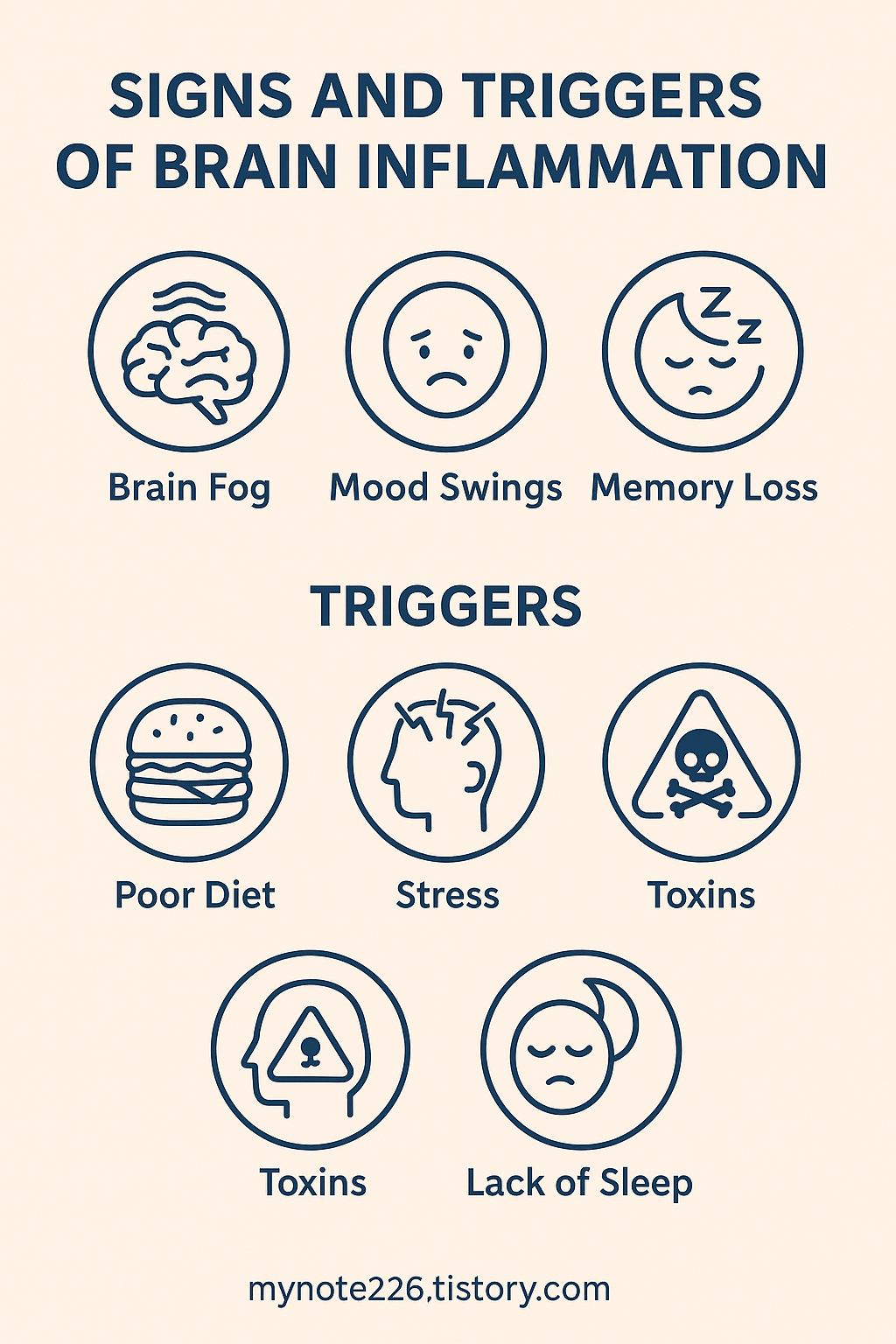 alt text : "Illustrated infographic showing signs and triggers of brain inflammation, including icons for brain fog, mood swings, memory loss, poor sleep, and stress. Designed for a health blog article on neuroinflammation risk."