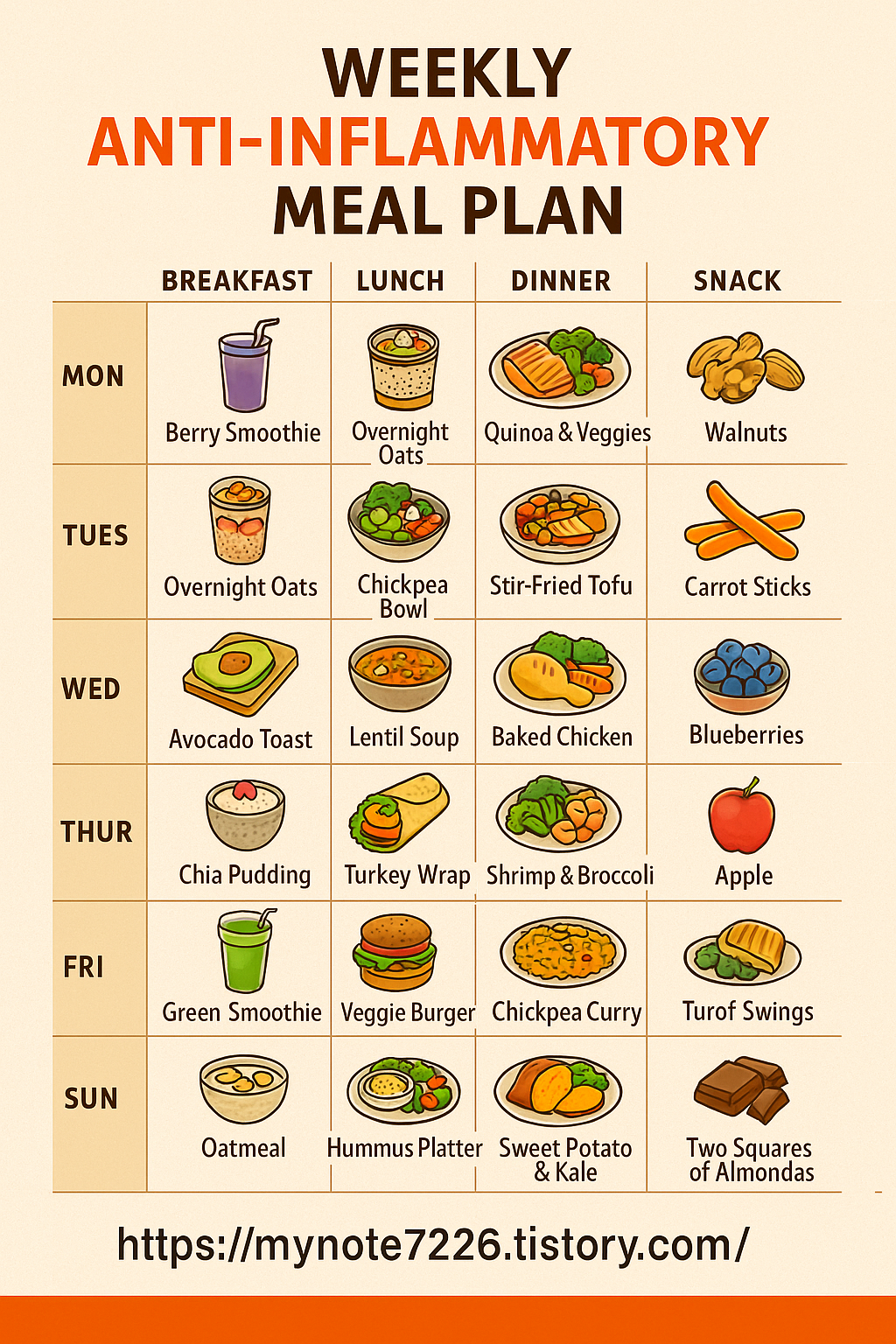 Alt Text: "Weekly anti-inflammatory meal plan with illustrated portions of breakfast, lunch, dinner, and snacks based on whole foods and clean eating principles."