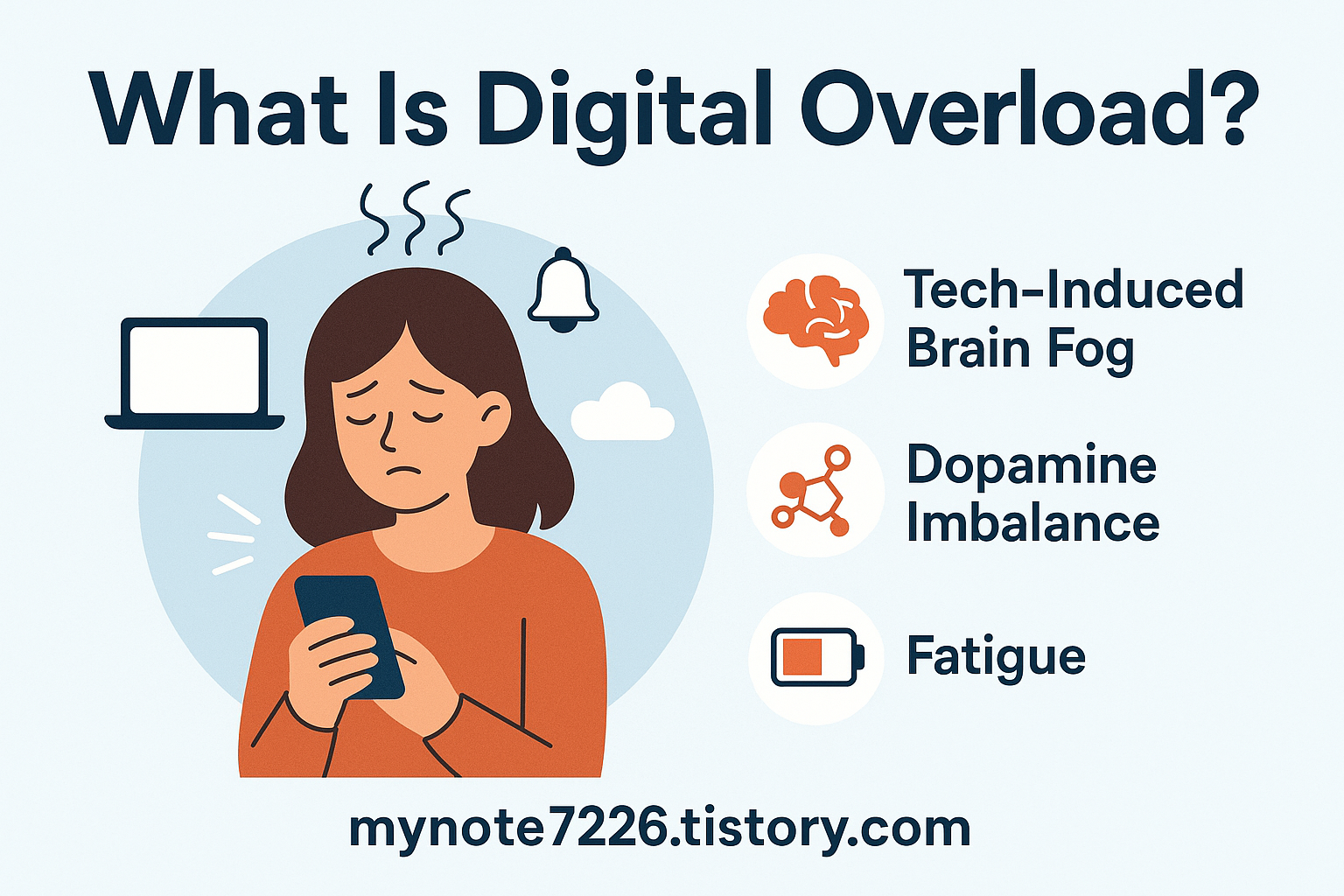 alt text: "Infographic showing a woman’s profile with brain icons illustrating digital overload effects: brain fog, dopamine imbalance, and fatigue."