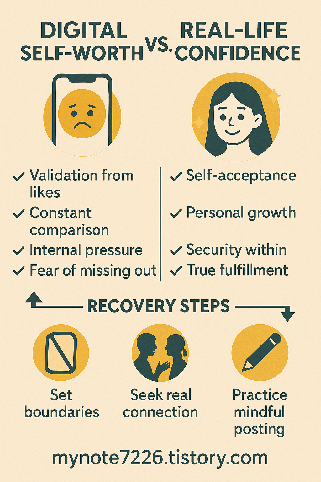 alt text: “Chart comparing digital self-worth vs. real-life confidence habits, showing recovery steps like boundaries, real connection, and mindful posting.”