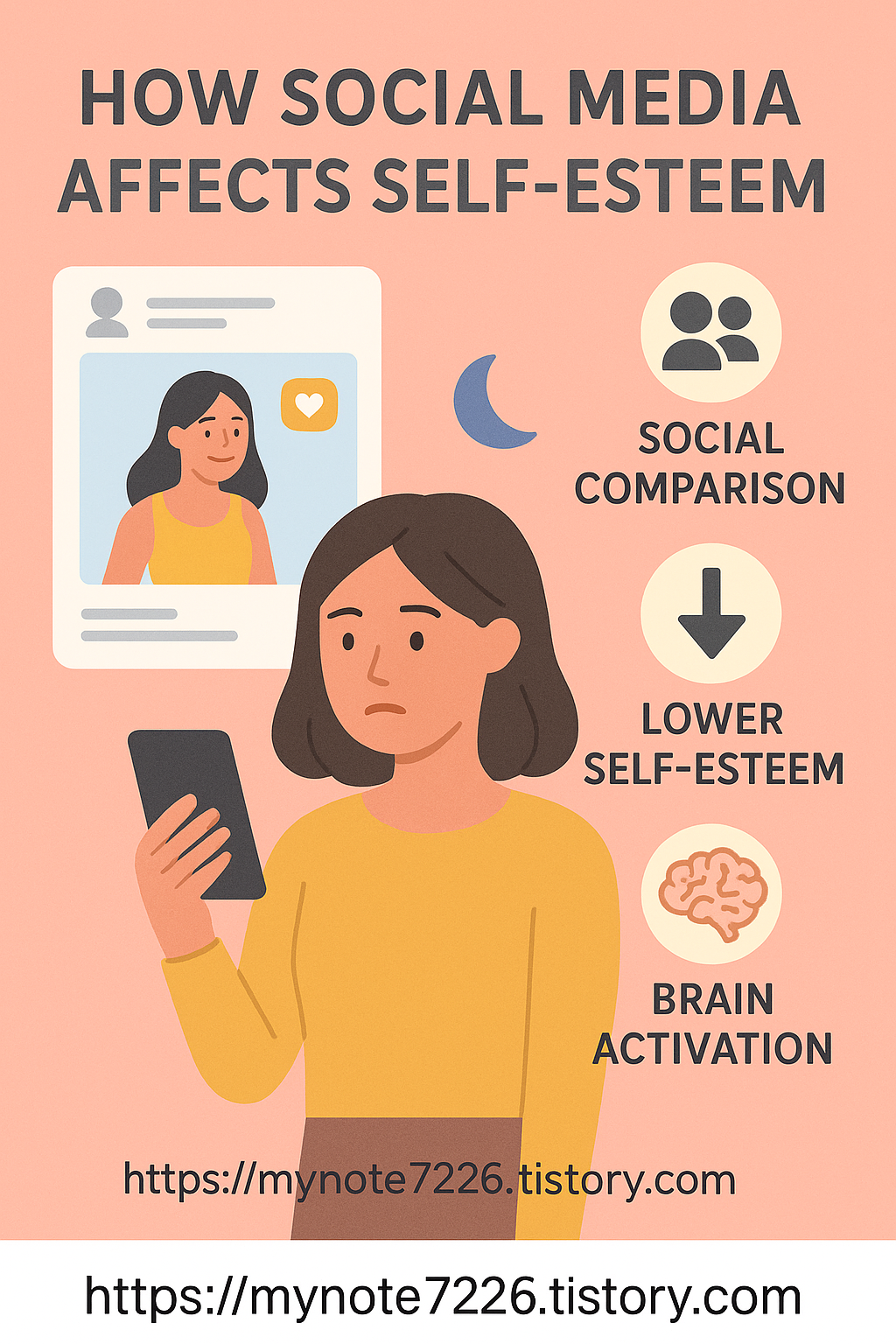 alt text: “Infographic showing how social media triggers social comparison, lowers self-esteem, and activates the brain’s identity and reward systems.”