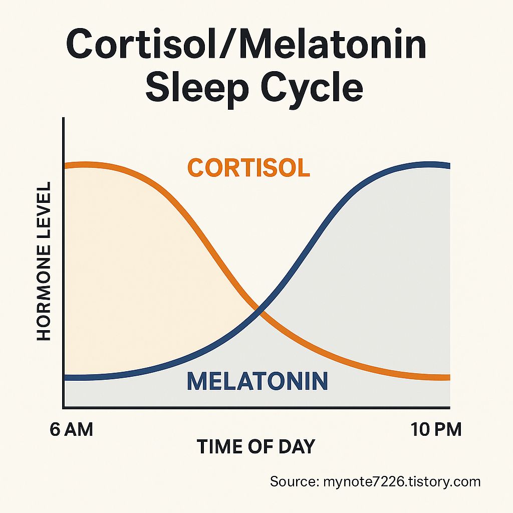 Alt text: Cortisol/melatonin sleep cycle. Source: mynote7226.tistory.com