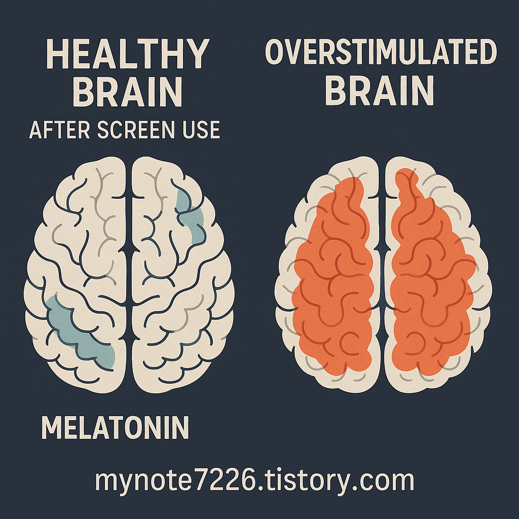 Alt Text: "Side-by-side brain scan showing healthy vs overstimulated brain after screen use. Blog address: mynote7226.tistory.com"