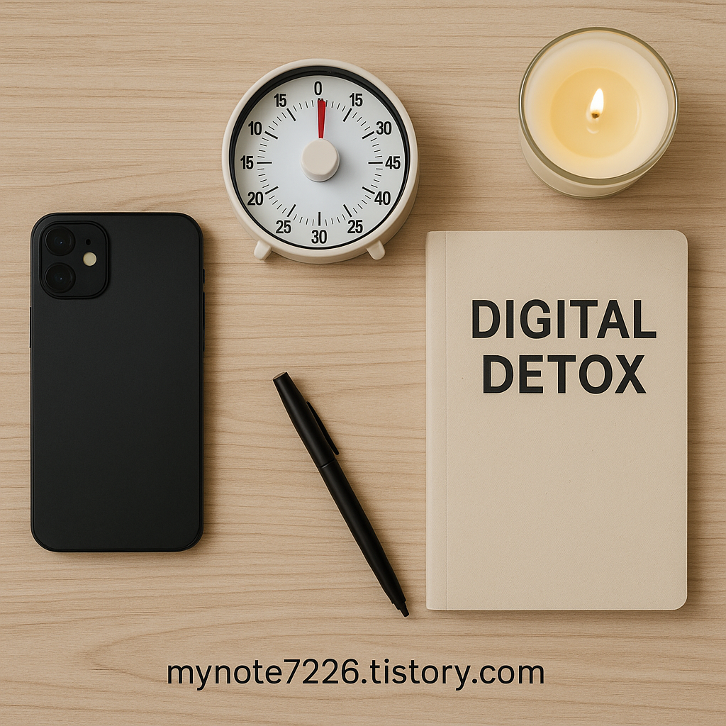Alt Text: "Flat lay of digital detox tools: phone face down, analog timer, journal, candle – Blog: mynote7226.tistory.com"
