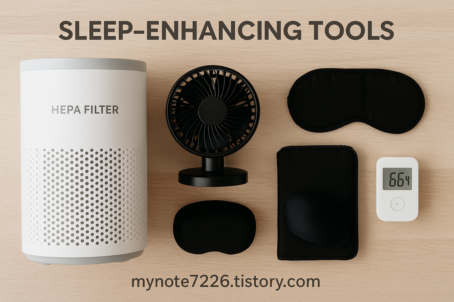 Alt Text: "Sleep-enhancing tools: HEPA filter, fan, eye mask, thermometer – Blog: mynote7226.tistory.com"