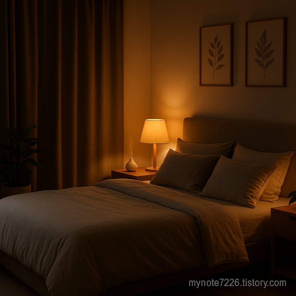 Alt Text: "Sleep-friendly bedroom setup: blackout curtains, amber lighting, no screens. Blog address: mynote7226.tistory.com"