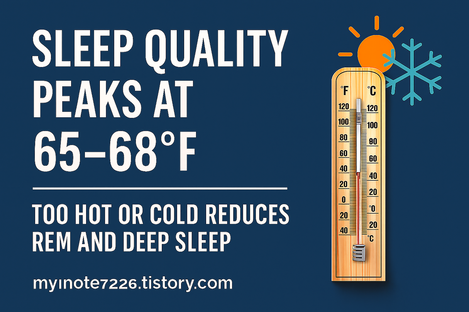 Alt Text: "Sleep quality peaks at 65–68°F. Too hot or cold reduces REM and deep sleep. Blog: mynote7226.tistory.com"