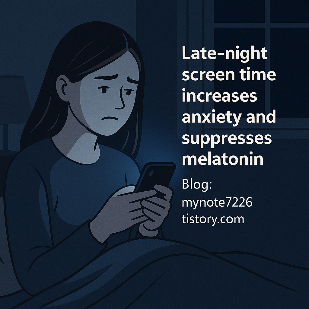 Alt Text: "Late-night screen time increases anxiety and suppresses melatonin – Blog: mynote7226.tistory.com"