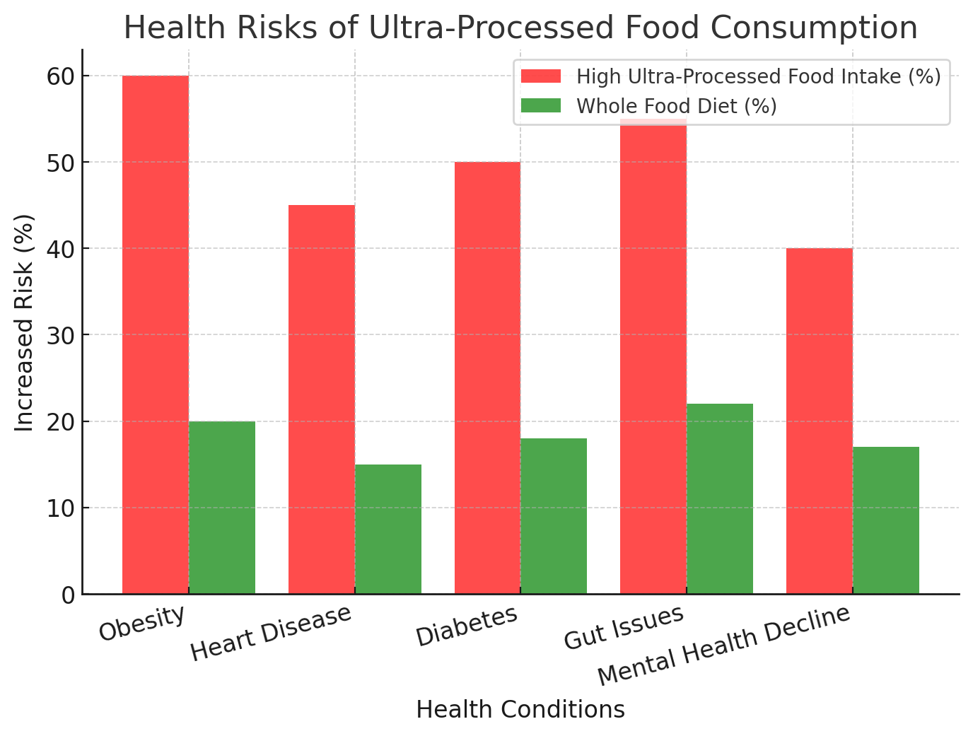 Did you know that over 50% of daily calories in many developed countries come from ultra-processed foods? A study published in The BMJ found that every 10% increase in ultra-processed food consumption is linked to a 12% higher risk of cardiovascular disease.